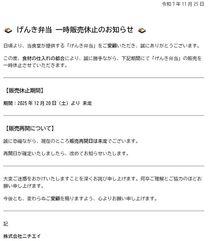 ・その他食事に関する問い合わせは 食堂業者ニチエイ 電話0494-55-0539 お問合せフォーム https://nichiei-meal.net/ へ